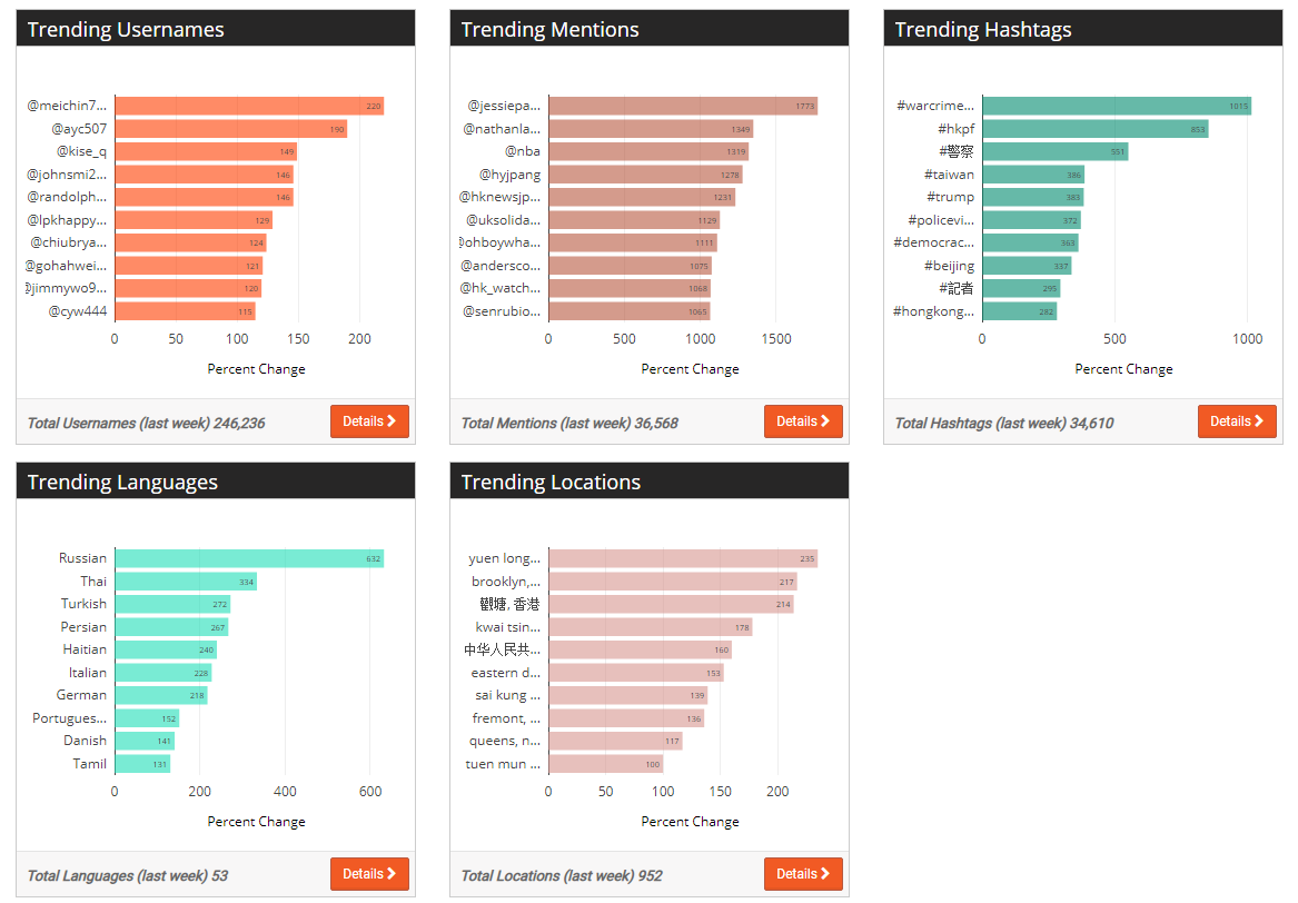 Display trends in activity for usernames, mentions, hashtags, URLs, languages, and locations
