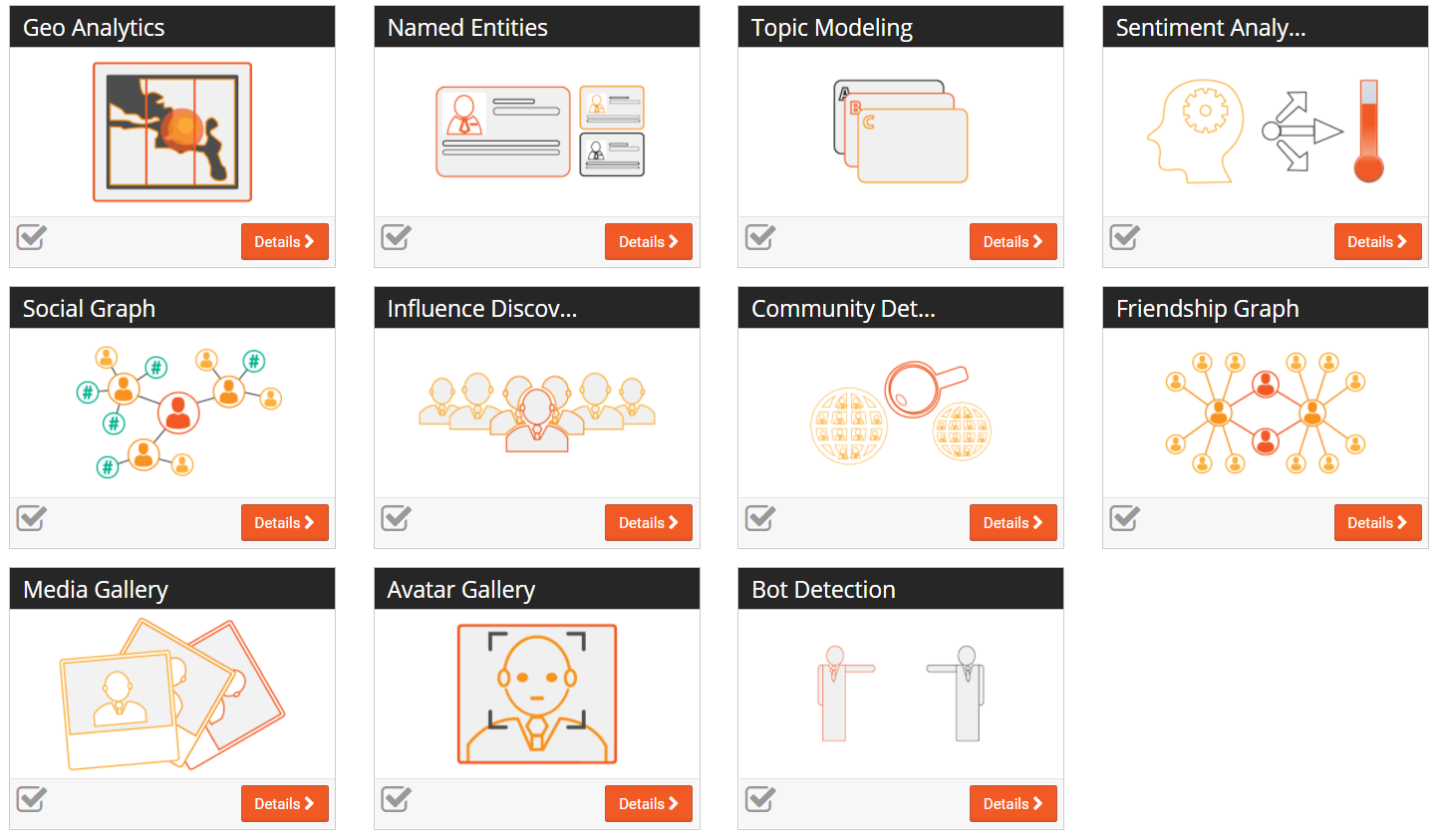 Word clouds, timeline views, heat maps, and community, social, and friendship graphs